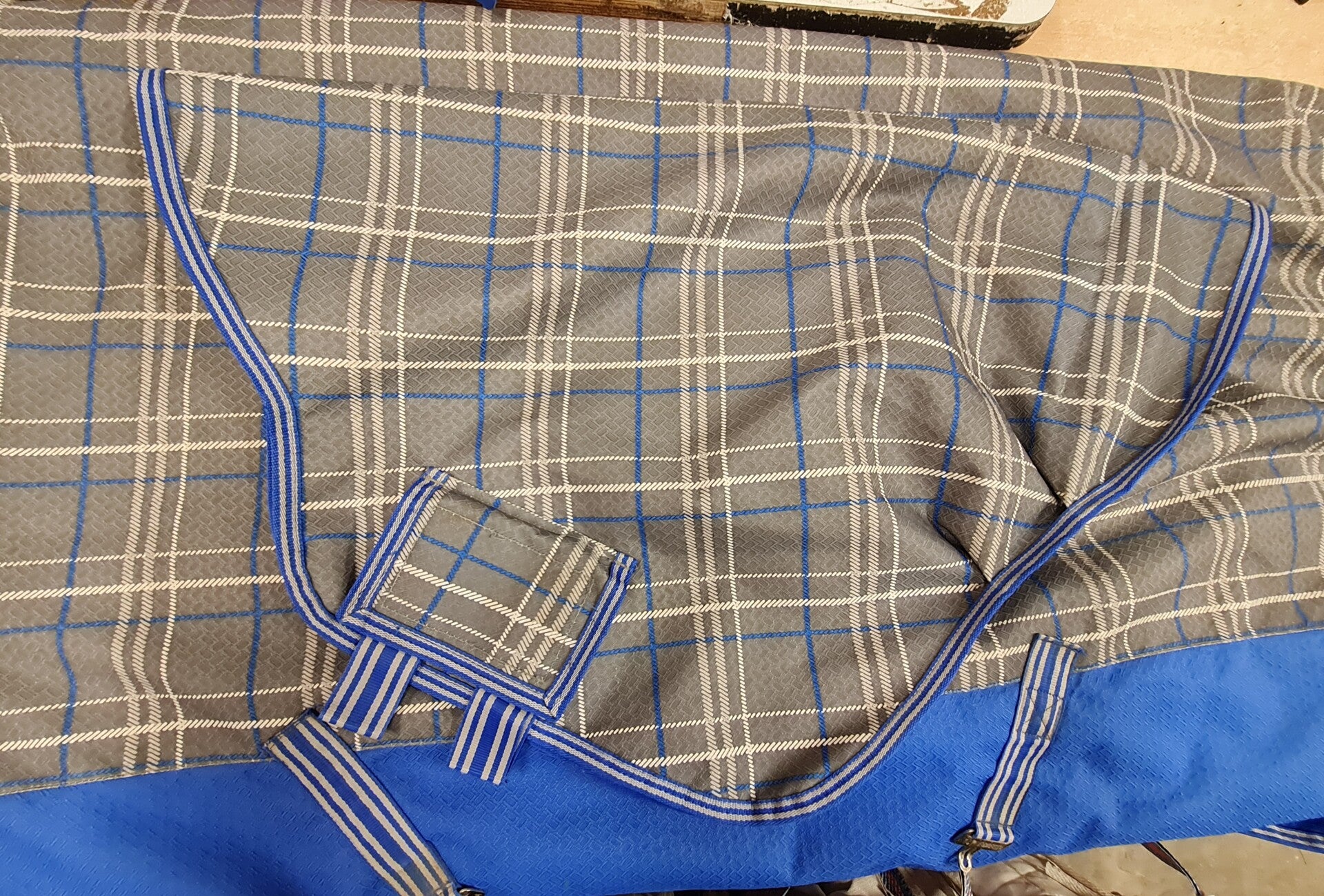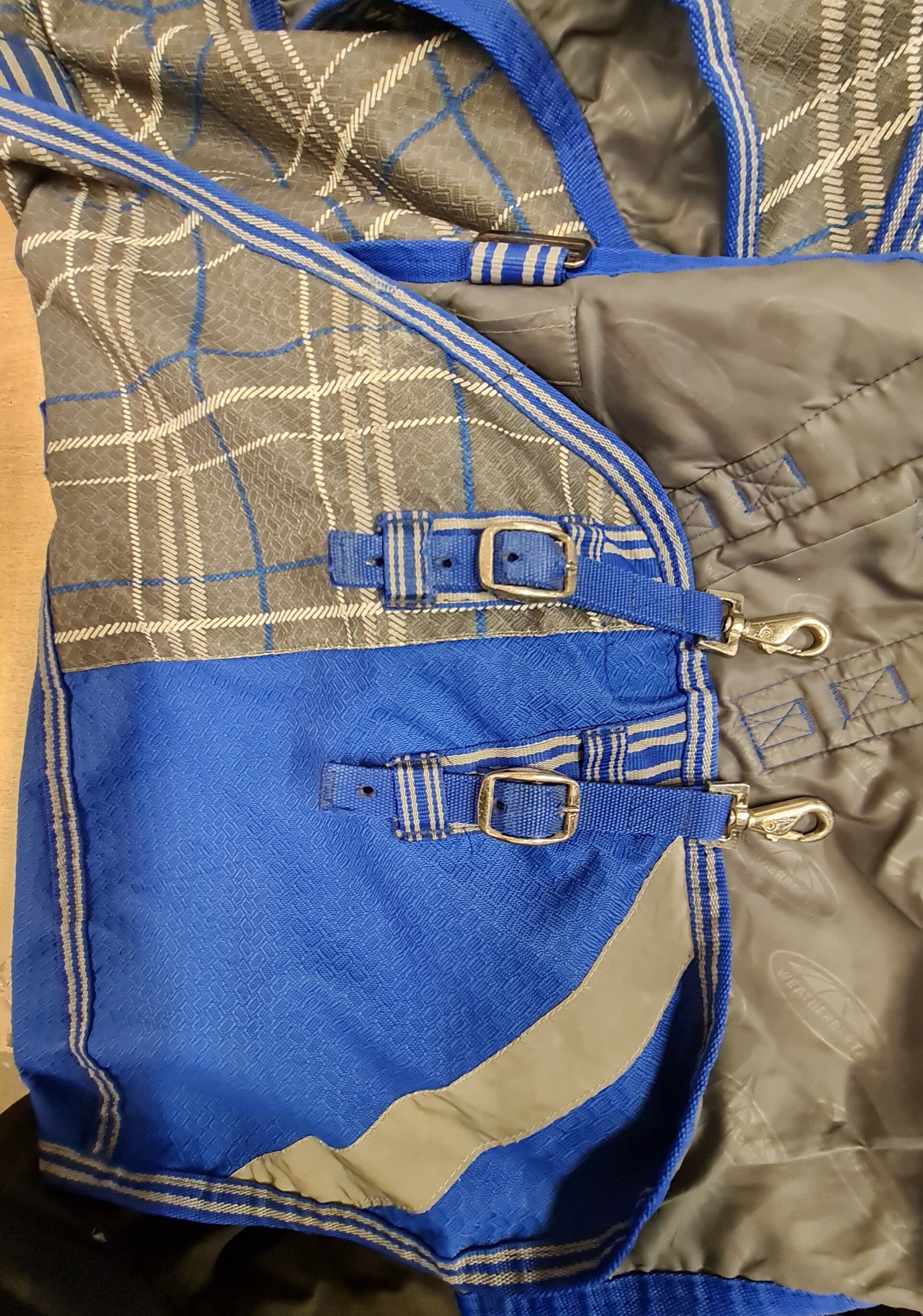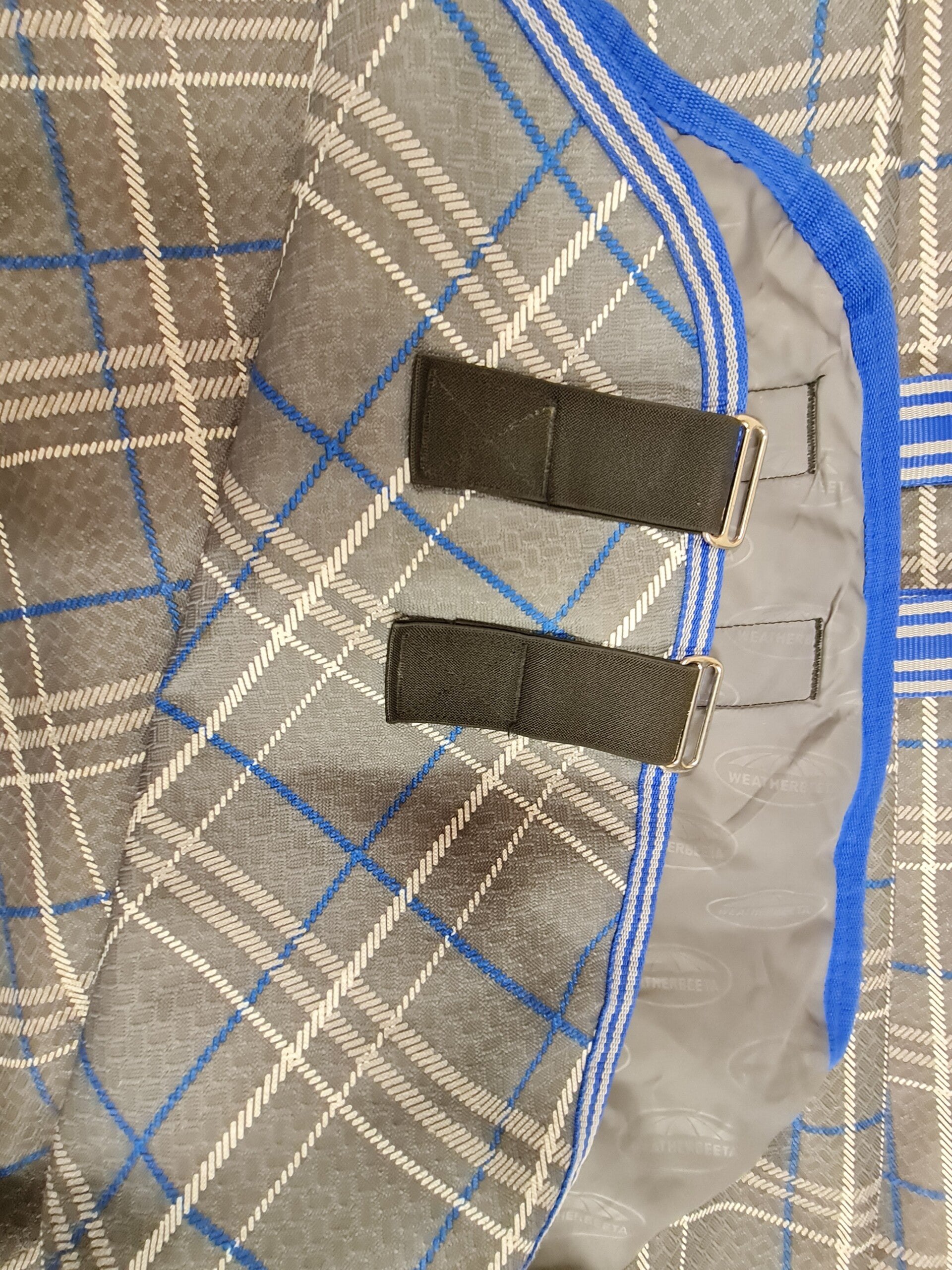 Weatherbeeta 100g Detachable neck turnout rug, has had a few repairs near tail flap on back of rug (see photos), metal work tarnished, liner compatible.
