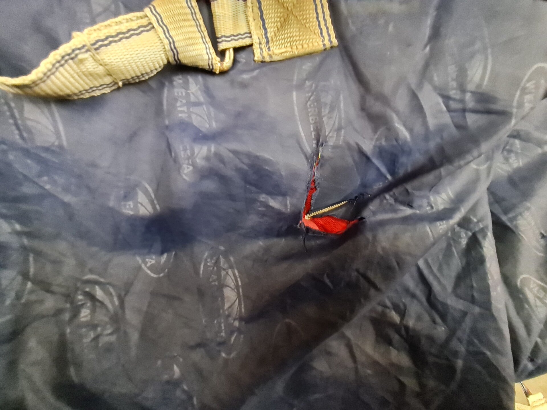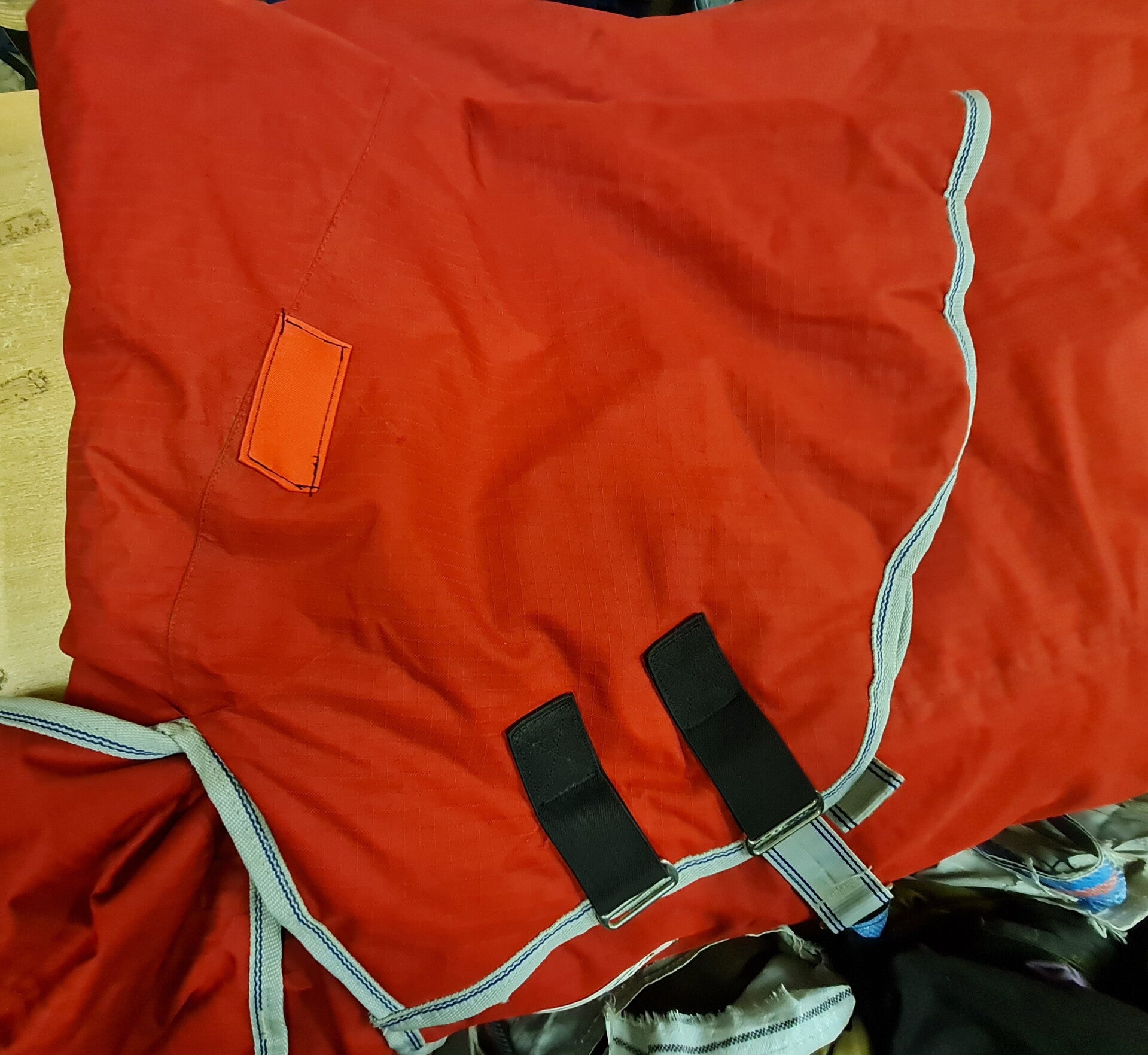 Two repairs, new leg strap. A few holes in lining, does have a few marks to outer. Plenty of wear left in this rug.