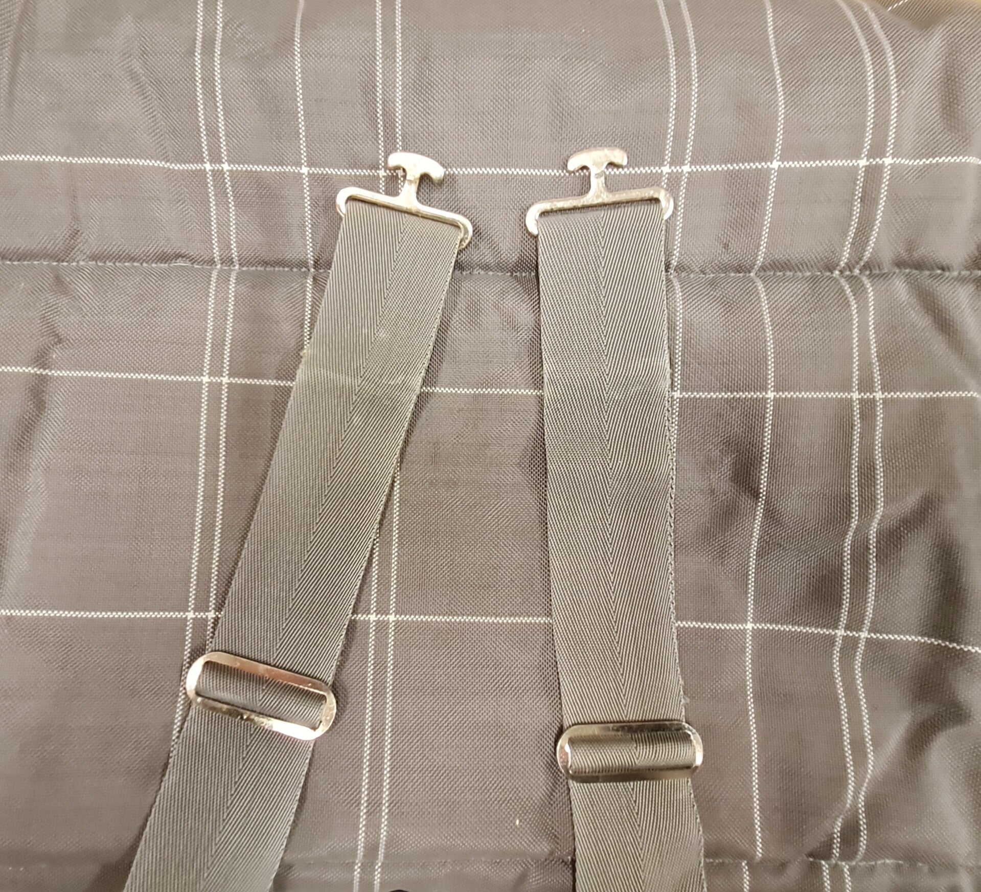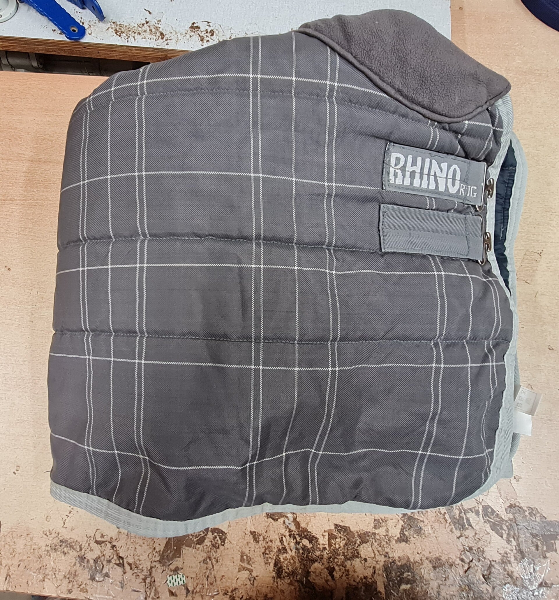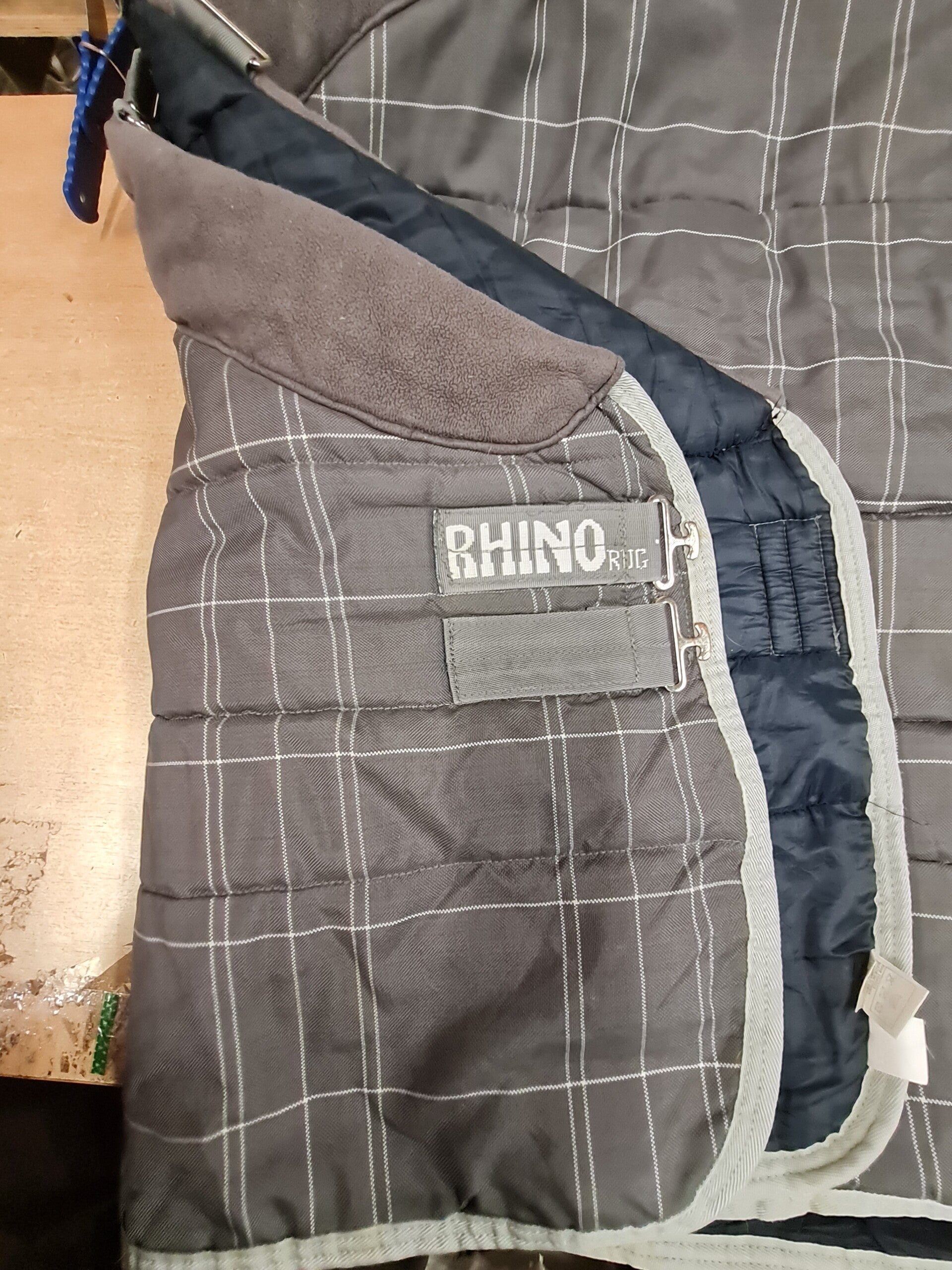 Horseware Rhino stable rug, does have a small hole near neck - see photo, doesn't have a weight label but guessing med/heavy. Liner and neck cover compatible.